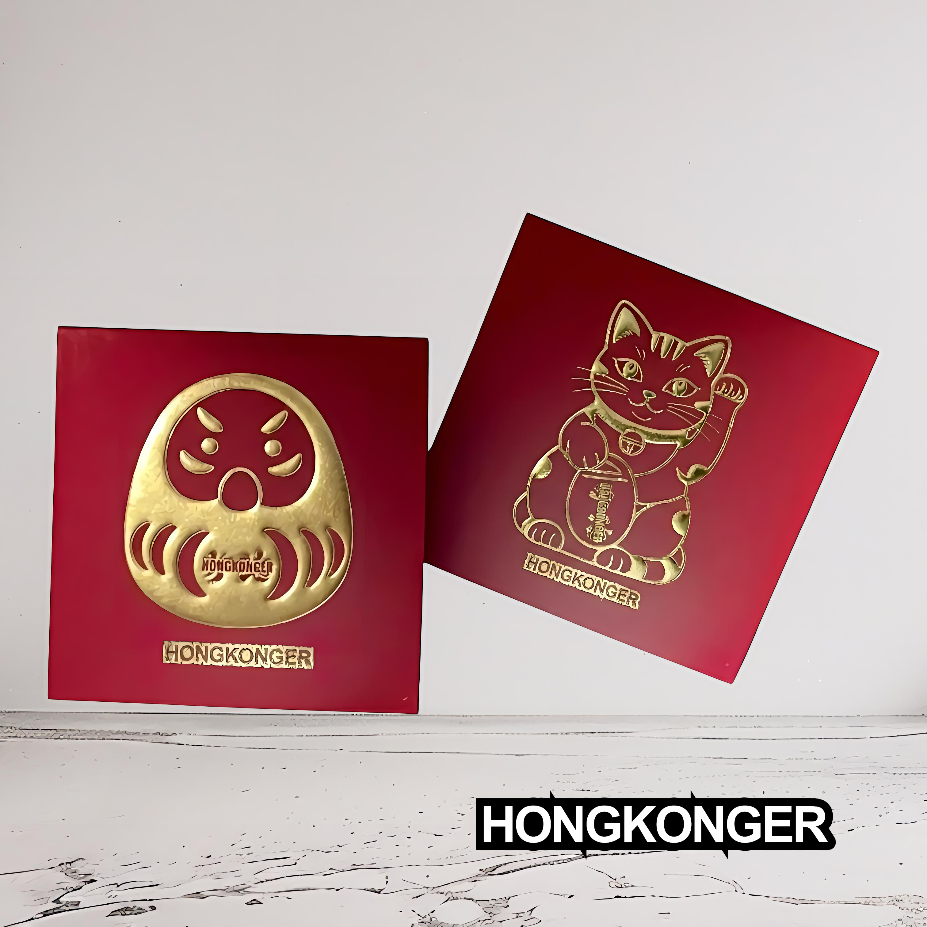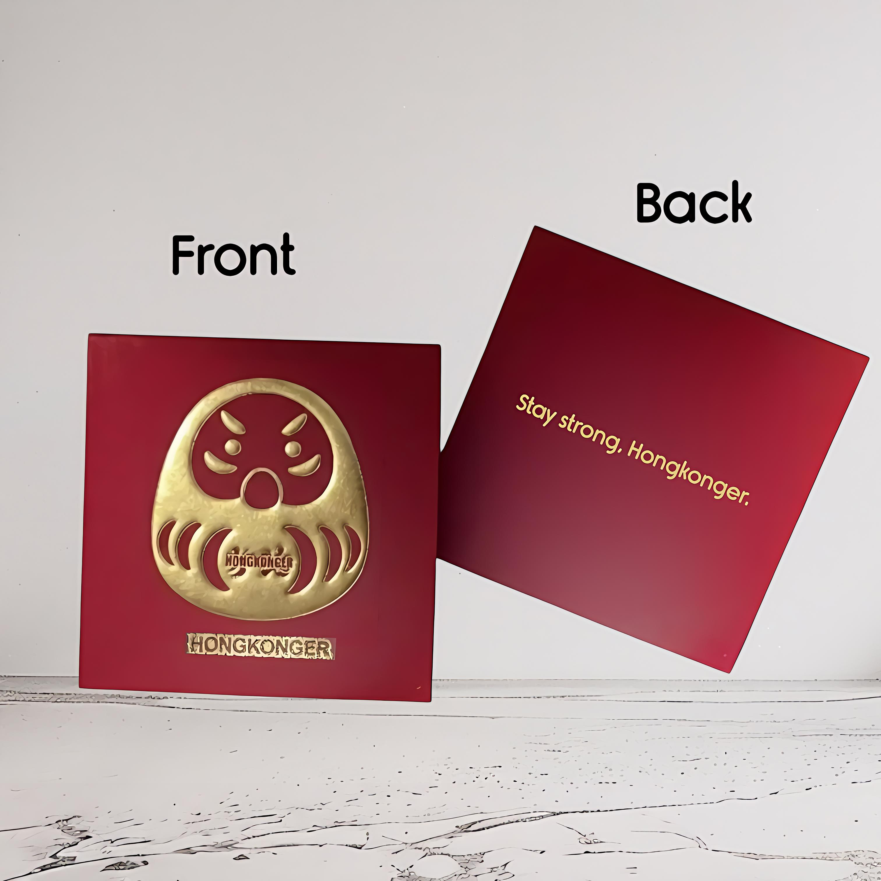 Front: 經典達摩與招財貓造型,配上獨家 "HONGKONGER" 字樣,採用高級金色浮凸工藝,立體感十足。